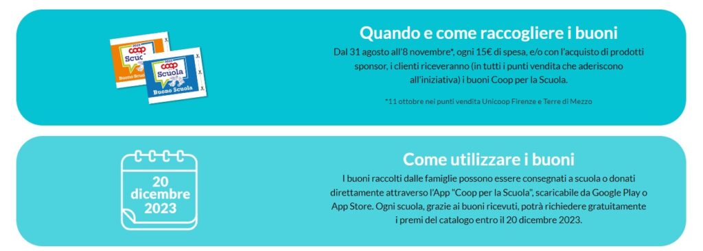 Dal 31 agosto 2023 al 8 novembre 2023, i clienti riceveranno, in base al regolamento dell’iniziativa, un buono che potrà essere donato direttamente alla propria scuola attraverso l’App Coop, disponibile per dispositivi iOS o Android (o in alternativa i buoni potranno essere consegnati a scuola).