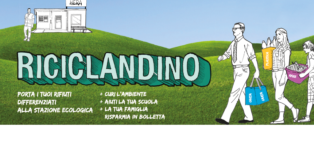 Progetto Riciclandino è dedicato al mondo della scuola dalle materne fino alle superiori, e coinvolge tutti, ragazzi e famiglie, in una divertente iniziativa ambientale. Infatti più raccolta differenziata si fa, più rifiuti si portano alle stazioni ecologiche, più punti si ottengono, dando così lopportunità alla propria scuola di ricevere incentivi economici. Così, tutti insieme, scuola, famiglia, servizi ambientali, oltre a fare qualcosa di buono per lambiente, possiamo aiutare le scuole, i ragazzi e migliorare il futuro di tutti noi.