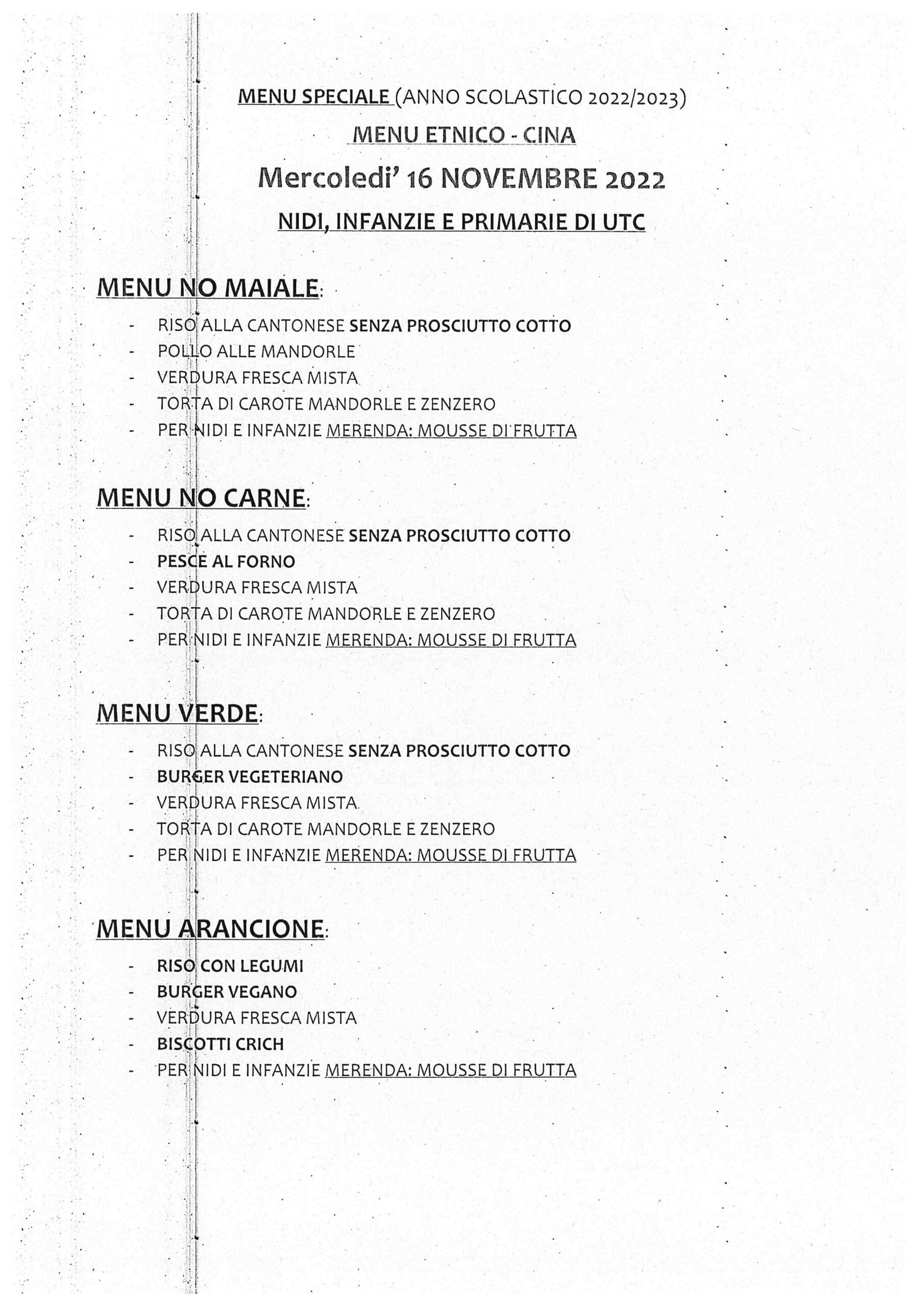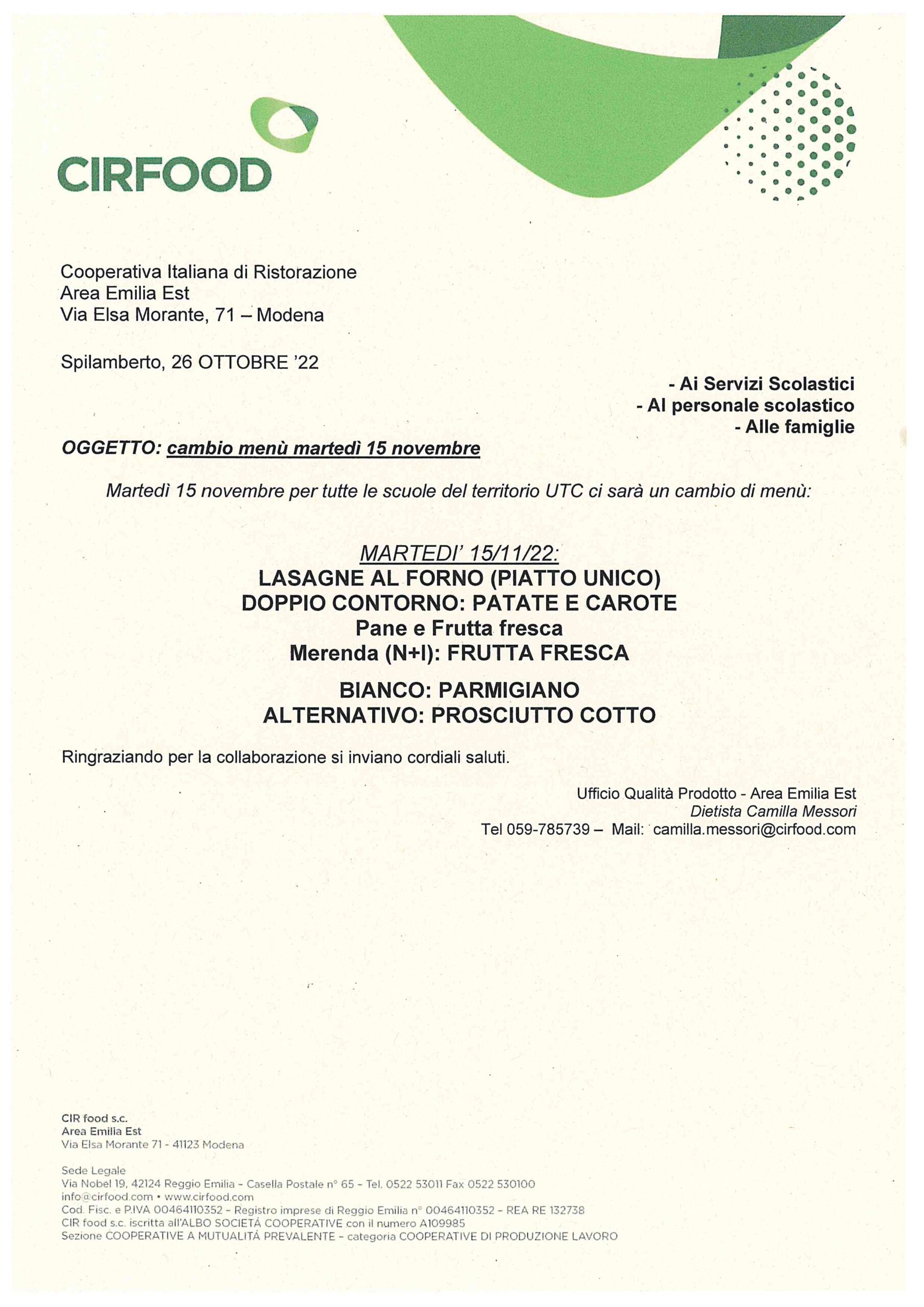 COMUNICAZIONE VARIAZIONE MENU’ MARTEDI’ 15 E MERCOLEDI’ 16 NOVEMBRE 2022