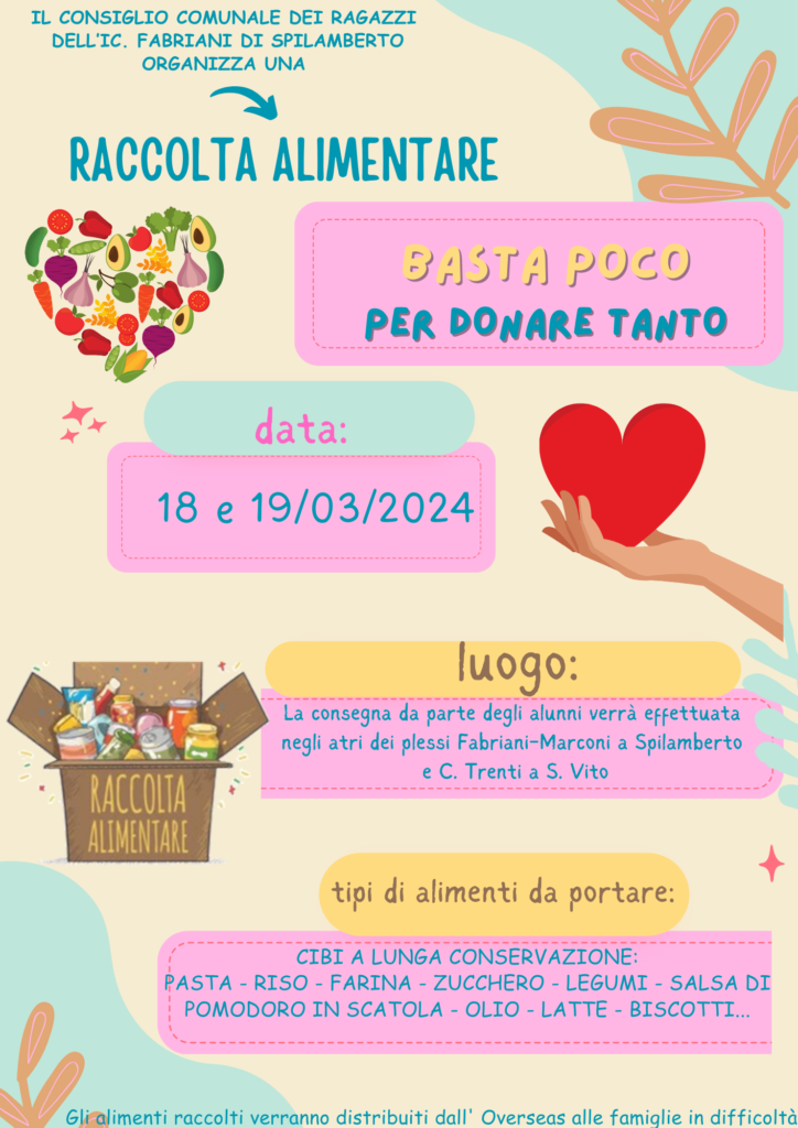 Il consiglio comunale dei ragazzi dell’I.C. Fabriani organizza, nelle giornate del 18 e 19 marzo 2024, una raccolta alimentare.