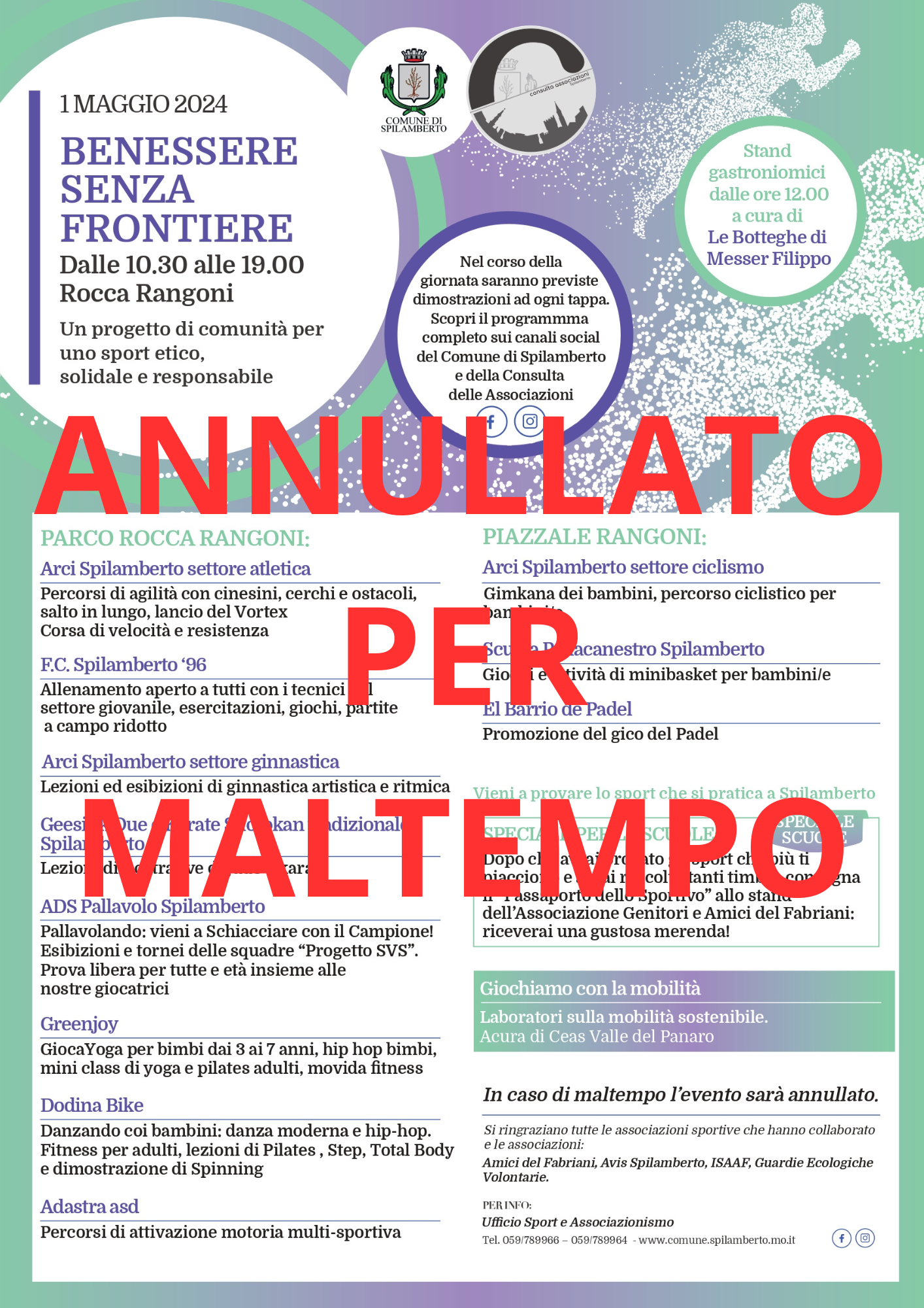 BENESSERE SENZA FRONTIERE – EVENTO DEL 01 MAGGIO ANNULLATO CAUSA MALTEMPO