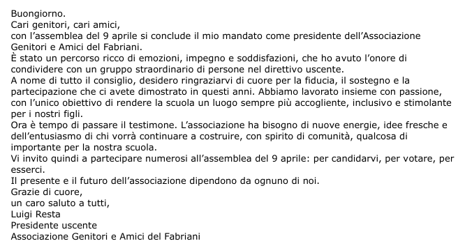 ASSEMBLEA DELL’ASSOCIAZIONE GENITORI E AMICI DEL FABRIANI DEL 09 APRILE 2025