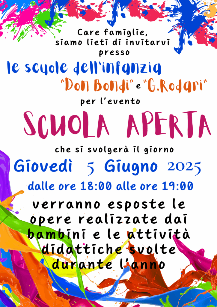 L’evento Scuola Aperta per le scuole dell’infanzia “Don Bondi” e “Rodari” si svolgerà il giorno 05/06/2025 dalle ore 18.00 alle ore 19.00