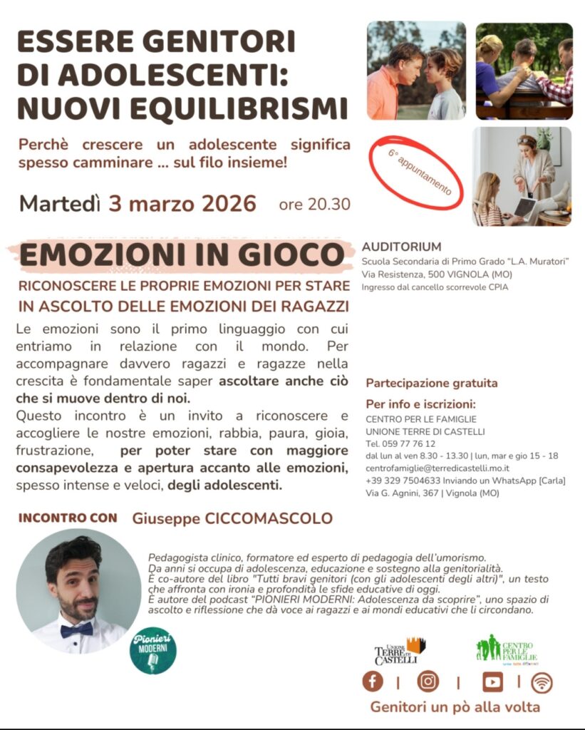 IL CENTRO PER LE FAMIGLIE DELL’UNIONE TERRE DI CASTELLI ORGANIZZA UN INCONTRO DAL TEMA “ESSERE GENITORI DI ADOLESCENTI: NUOVI EQUILIBRISMI”