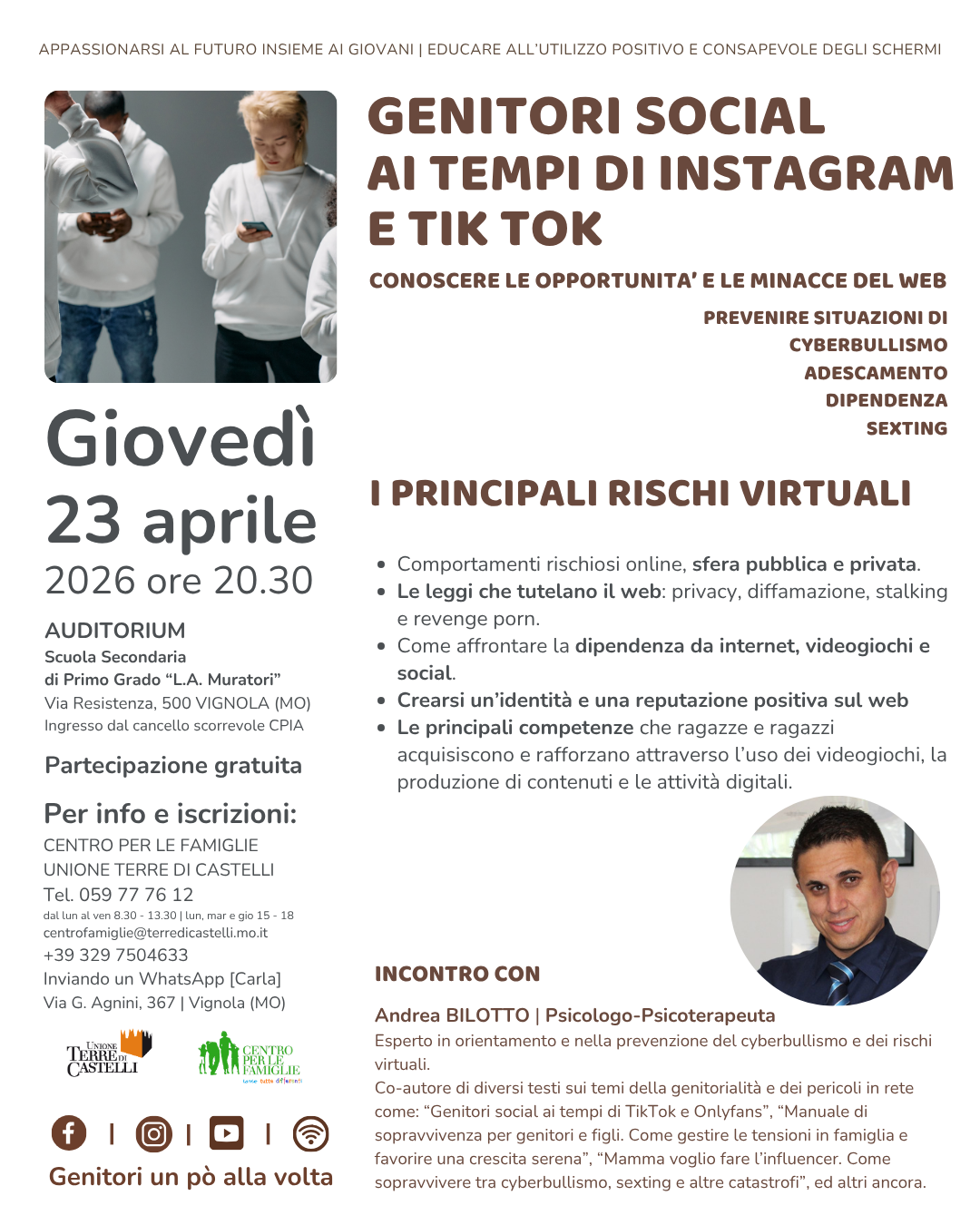 IL CENTRO PER LE FAMIGLIE DELL’UNIONE TERRE DI CASTELLI ORGANIZZA UN INCONTRO DAL TEMA “GENITORI SOCIAL AI TEMPI DI INSTAGRAM E TIK TOK”